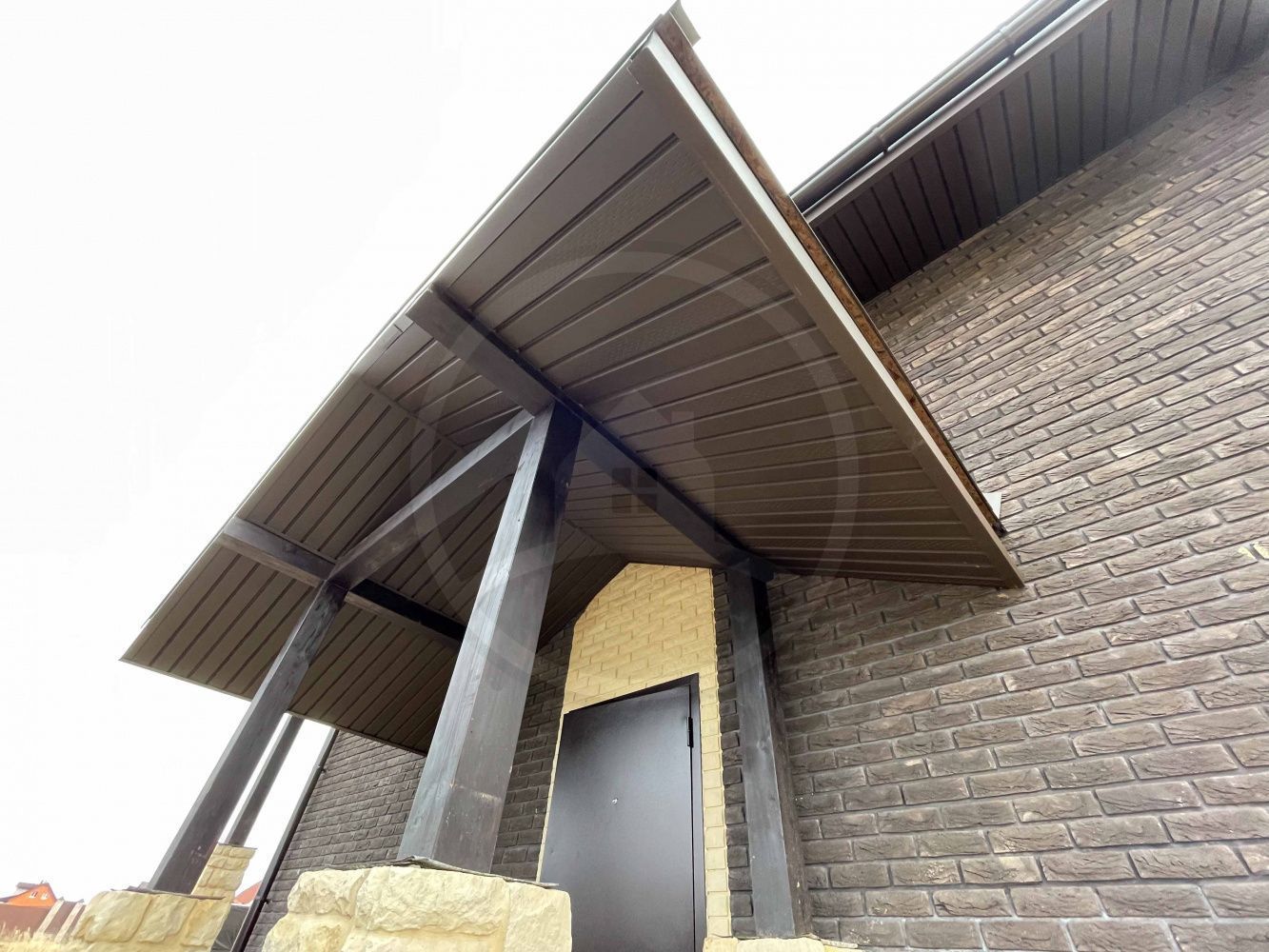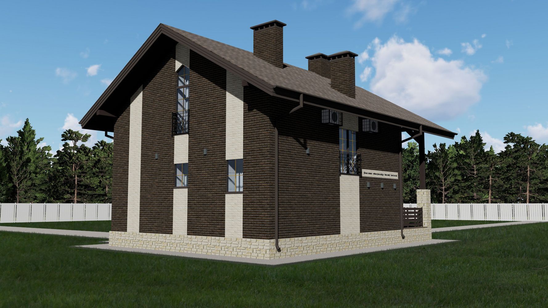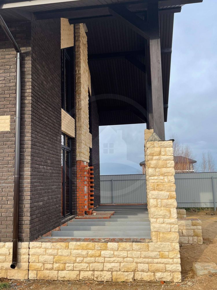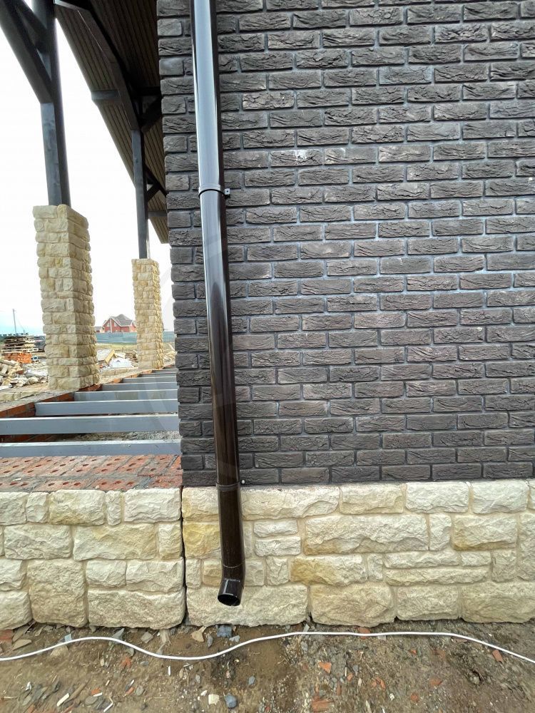 • Цоколь выполнять из керамического полнотелого кирпича марки не менее М150 (размерами 250х120х65мм) с последующей наружной отделкой из искусственного камня White Hills (Данвеган 500-10).