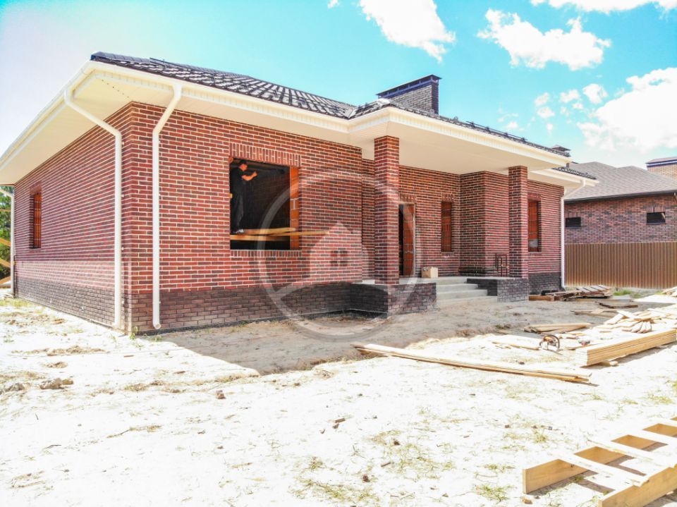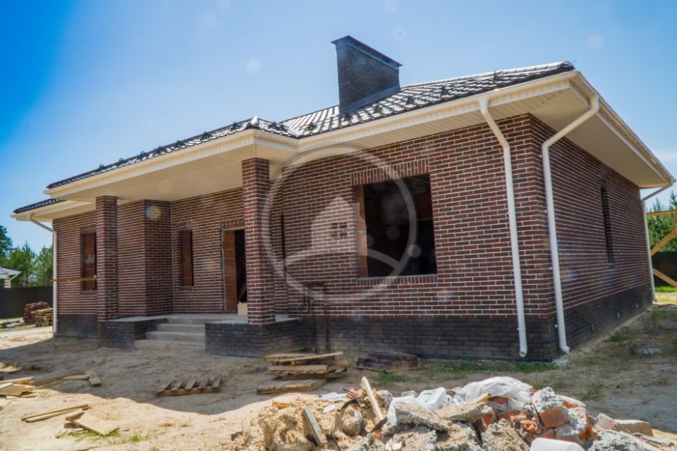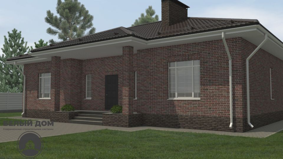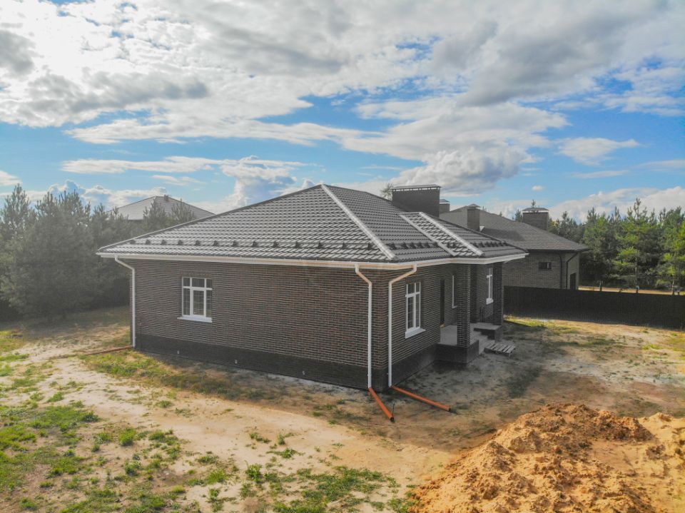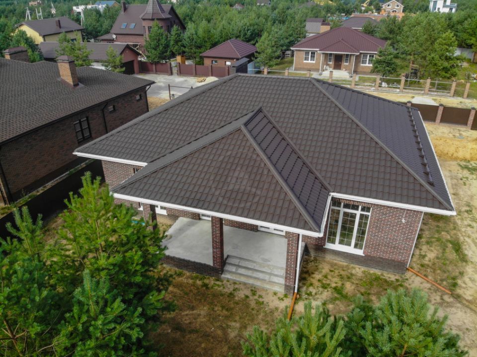 • Над окнами применена система подвесов кирпича BAUT Кровля - металлочерепица Kvinta, производитель - Grand Line, покрытие Velur RAL 7024